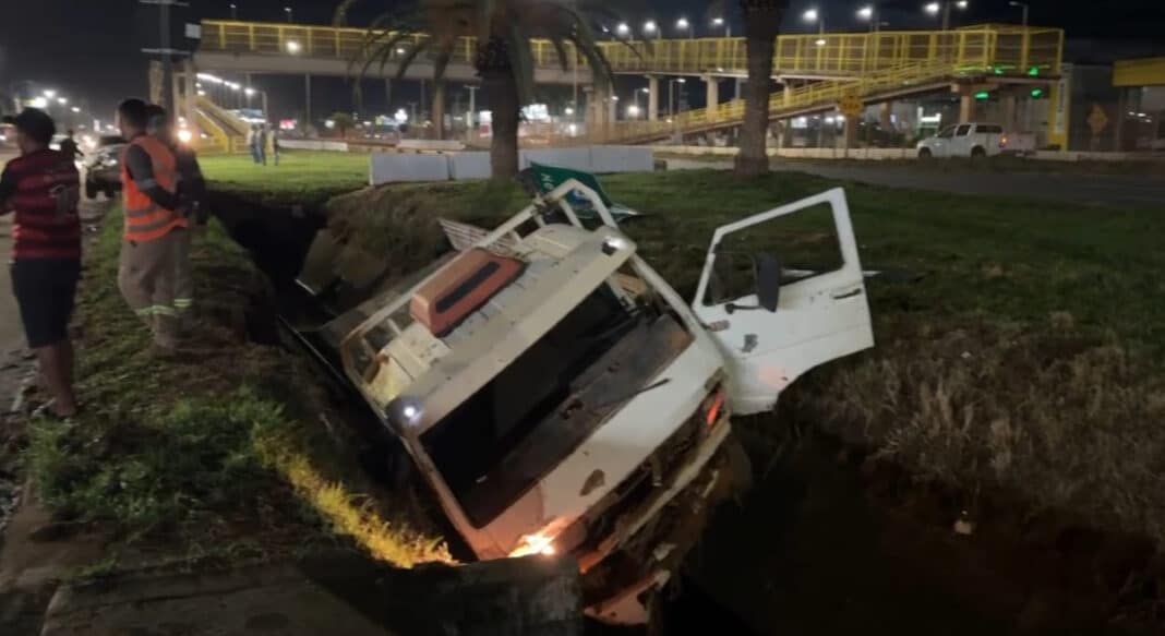 Com o impacto, o caminhão caiu na vala de escoamento e o carro teve danos consideráveis na parte traseira.