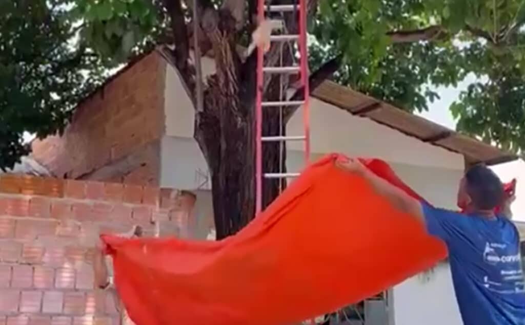 Foram utilizados aparatos de salvamento em altura, como escada e cordas estáticas, para alcançar a posição exata do felino em segurança. Em seguida, os profissionais estenderam uma manta para reduzir o impacto de queda do mesmo.