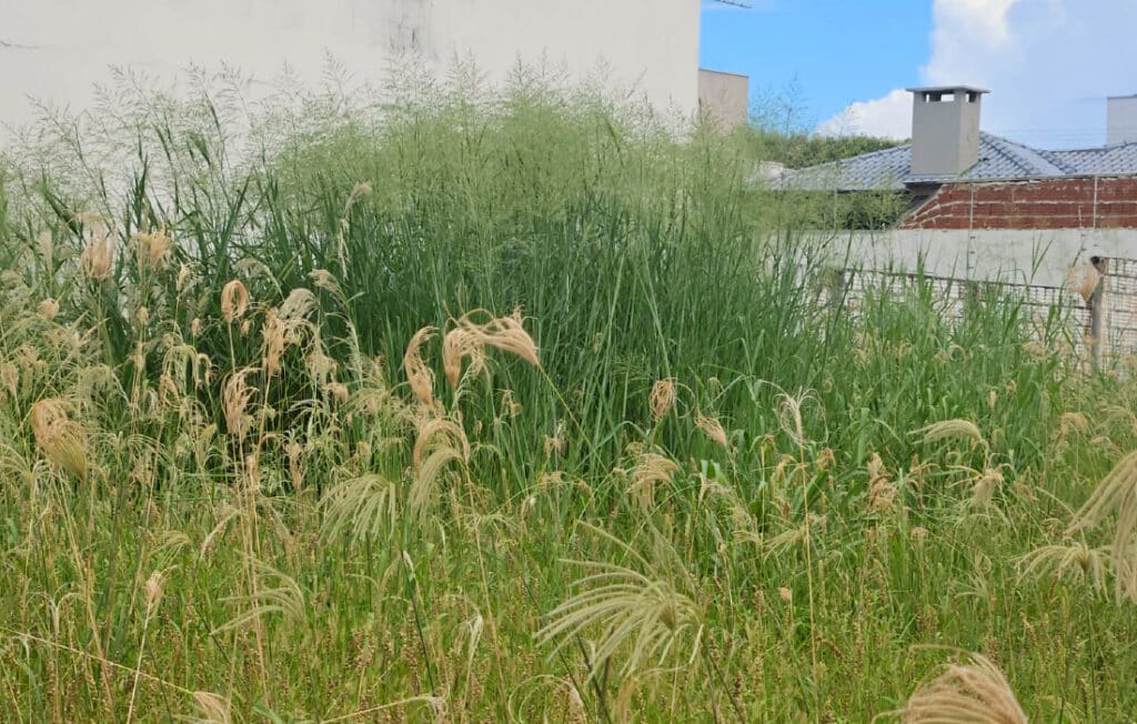 Moradores e empresários estão reclamando do mato alto em terrenos baldios que chega a ultrapassar os muros de algumas casas nas proximidades da rotatória das avenidas Blumenau com a avenida João Baptista Francio, no bairro Recanto dos Pássaros.