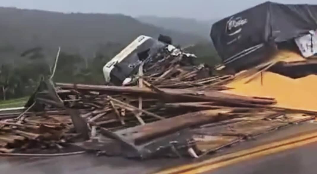 A versão relatada, inicialmente, é que os veículos de carga se envolveram em colisão lateral e posteriormente tombaram. Parte dos carregamentos (grãos de soja e tábuas de madeira) foram espalhados na pista e o sentido sul precisou ser bloqueado para a limpeza.