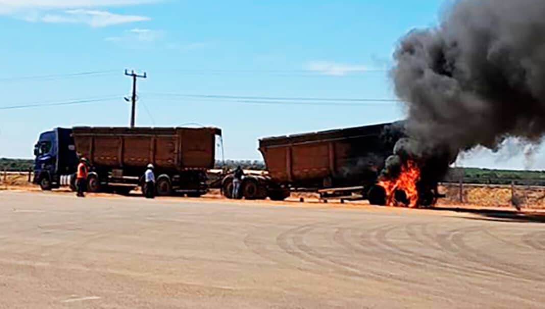 O vagão de uma carreta Man TGX 41.540 azul foi parcialmente danificado pelas chamas, esta tarde, enquanto deixava o pátio de um estabelecimento, situado às margens da rodovia federal (BR-163) em Nova Mutum.