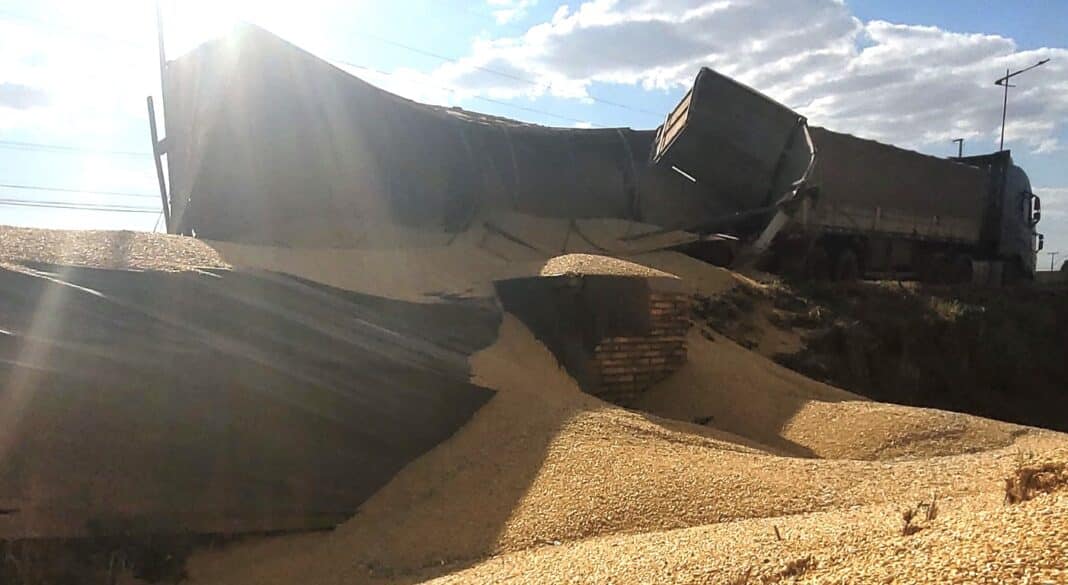 Vagão de carreta tomba em Sinop e toneladas de milho caem; tráfego em meia pista