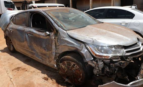 Com o capotamento, o veículo ficou destruído, com a lataria amassada, para-choque arrancado, tampa do porta-malas completamente retorcida e com muita lama na parte interna.