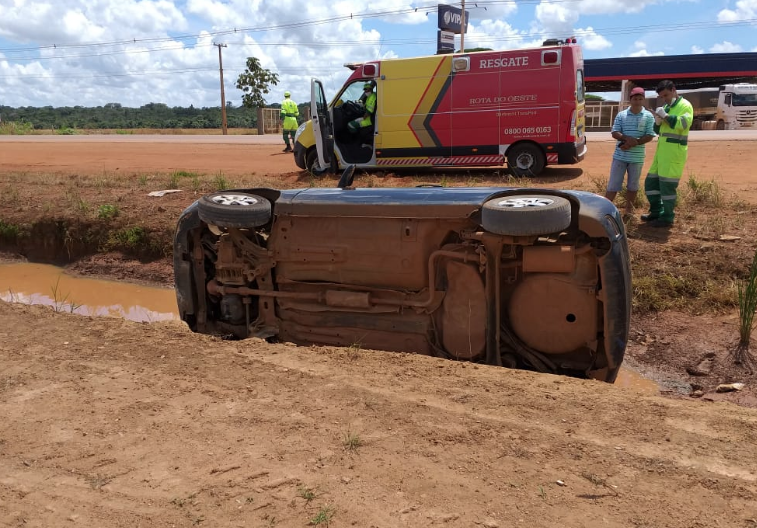 O acidente ocorreu há pouco, no quilômetro 840 da BR-163, nas proximidades da sede do Comando Regional da Polícia Militar. O condutor de um Fiat Pálio azul, com placas de Sorriso, saiu da pista, tombou e acabou caindo na vala de escoamento de água.
