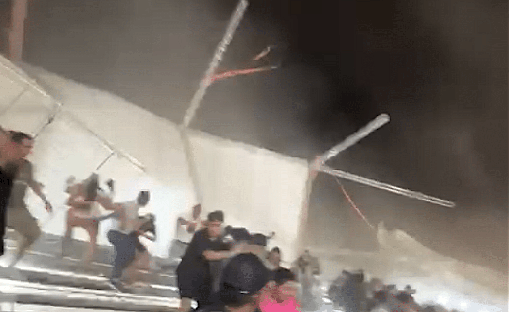 A cobertura de lona, que estava presa na estrutura metálica, não resistiu aos ventos e caiu na parte posterior, atingindo diversos carros que estavam estacionados. As pessoas saíram rapidamente da arquibancada, que não caiu. Havia mulheres e crianças.