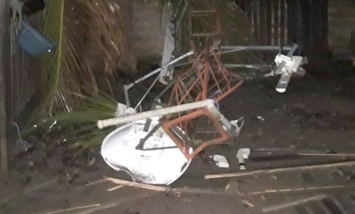 Em uma residência, a lateral de um caixa d’água foi “rasgada” e o plástico por onde vai a encanação ficou pendurada. Também houve danificação em uma panificadora na região central, o toldo se desprendeu da estrutura de concreto e ficou suspenso, sendo sustentado por uma outra parte.