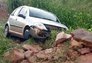 O carro ficou na vegetação “encavalado” nas pedras. Com a colisão, o para-choque quebrou. Não foram informados os danos mecânicos.