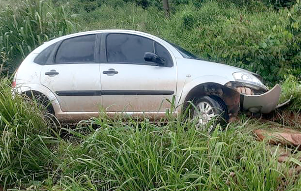 O carro ficou na vegetação “encavalado” nas pedras. Com a colisão, o para-choque quebrou. Não foram informados os danos mecânicos.