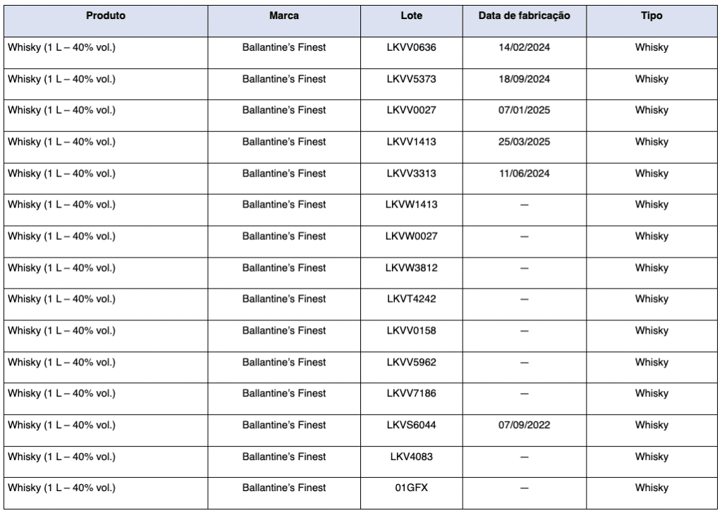 A secretaria estadual de Saúde (SES-MT), por meio da Coordenadoria de Vigilância Sanitária do Estado de Mato Grosso emitiu hoje uma comunicação de risco para contaminações por metanol com o 15º lote de bebida sob suspeita de adulteração. As evidências laboratoriais e periciais indicam vínculo entre os casos e o consumo de whisky da marca Ballantine’s Finest, com 15 lotes que apresentam indícios de falsificação, mediante o uso de vasilhames originais da marca, que teriam sido envasados de forma clandestina com produto falsificado: