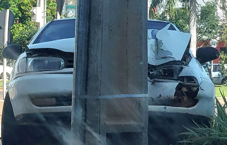 Um VW Gol foi apreendido, há pouco, pelos agentes da Guarda Civil Municipal, no cruzamento das avenidas dos Jacarandás com Tarumãs, no centro de Sinop. O carro bateu violentamente num poste da rede de energia elétrica e ficou com a parte da frente completamente destruída.