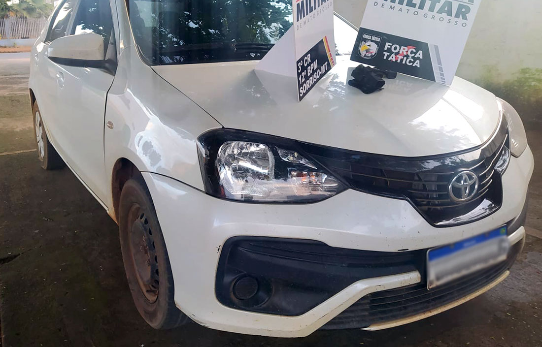 O Toyota Etios branco foi recuperado, ontem à noite, por policiais militares da Força Tática após perseguição na MT-560. O veículo apresentava registro de roubo/furto, cometido no ano passado. Não foram divulgados detalhes sobre este crime. Os ocupantes conseguiram fugir para a mata.