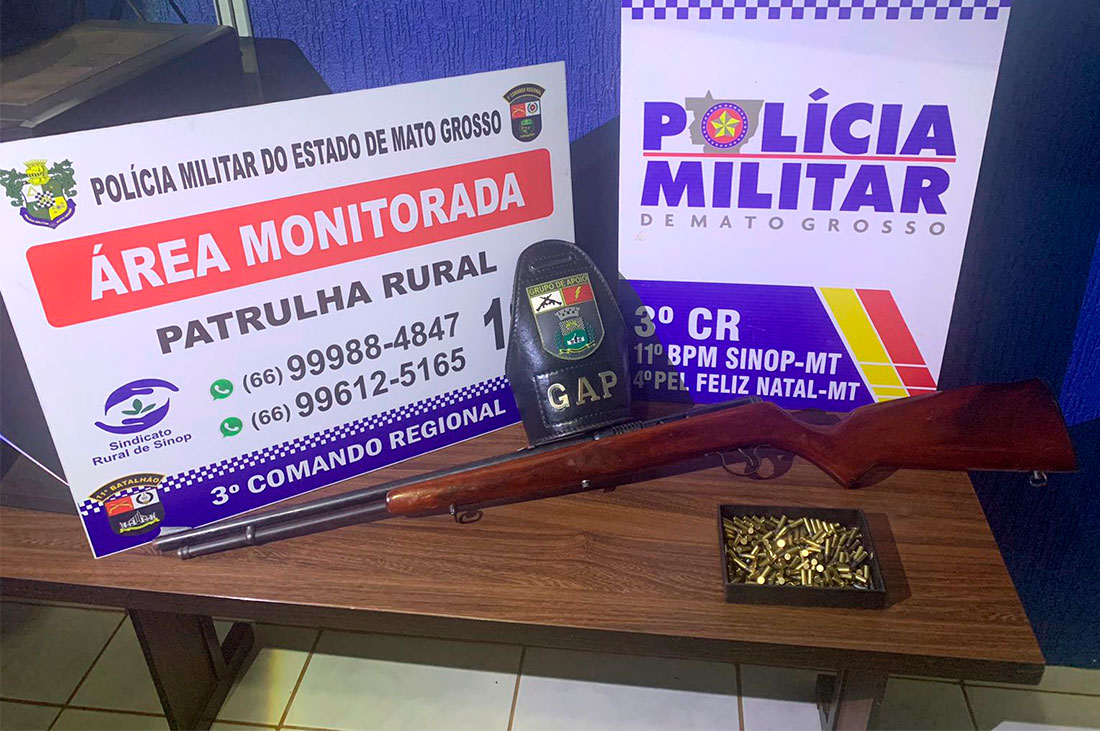 Policiais militares de Sinop que faziam, ontem, o patrulhamento rural na estrada da soja, no município de Feliz Natal, apreenderam uma espingarda calibre 22, além de 189 munições.