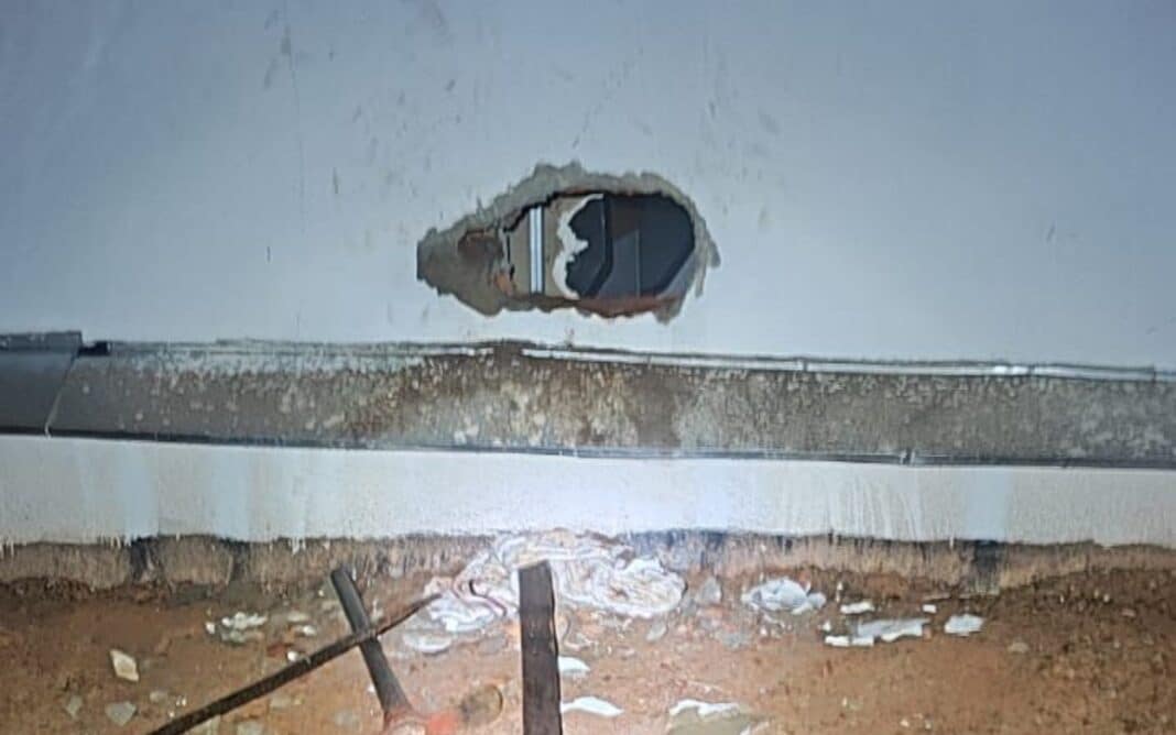 Ainda segundo os militares, o alarme da agência bancária disparou e o monitoramento indicou presença de pessoas encapuzadas. Não foram encontrados sinais anormais no banco, mas durante varredura, foi encontrado um buraco no muro da residência vizinha, usado para entrar na agência.