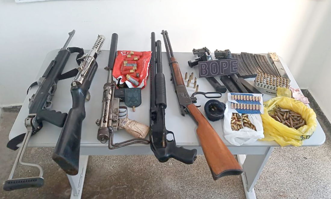 Ao fazer rondas no local os policiais avistaram alguns homens que saíram correndo de uma casa e entraram em outra. Na “moradia” onde eles estavam, o Bope encontrou um fuzil (calibre 5,56), duas submetralhadoras semiautomáticas, uma delas com silenciador de ruídos, além de duas pistolas (uma calibre .40 e outra 380), uma carabina (.357), uma espingarda calibre 12 e mais de 150 munições dos respectivos calibres das armas.