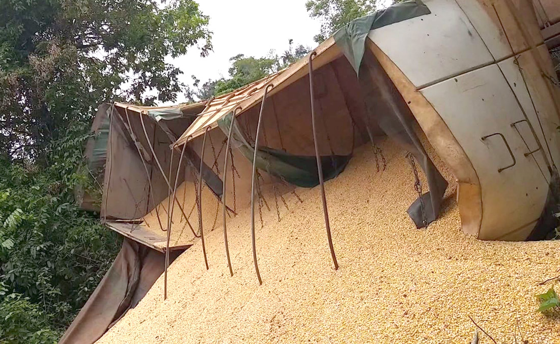 Caminhão tomba e tem mais de 12 toneladas de milho saqueadas no Nortão
