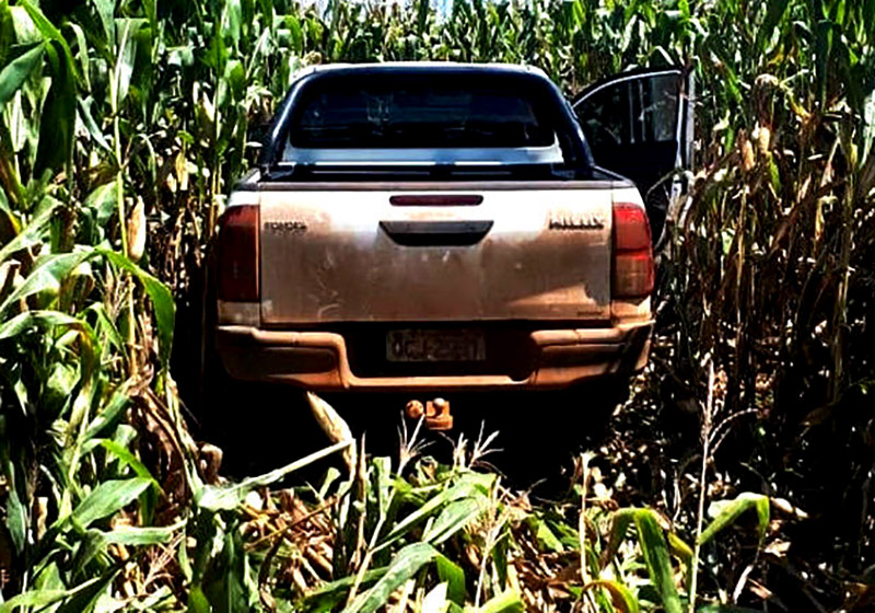 Uma Toyota Hilux prata foi encontrado pela Policia Militar escondida no milharal em uma fazenda, nas proximidades de uma comunidade rural de Lucas do Rio Verde, esta tarde. De acordo com um sargento da PM, a localização foi possível após uma denúncia anônima.