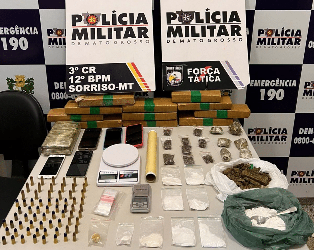 Os militares foram para o interior da casa e localizaram ainda a quarta suspeita, uma adolescente de 17 anos. Em buscas pelo imóvel, foram encontrados 12 tabletes de maconha, uma sacola e porções grandes de cocaína, duas balanças de precisão e cerca de 70 munições de calibres .38 e .9mm.