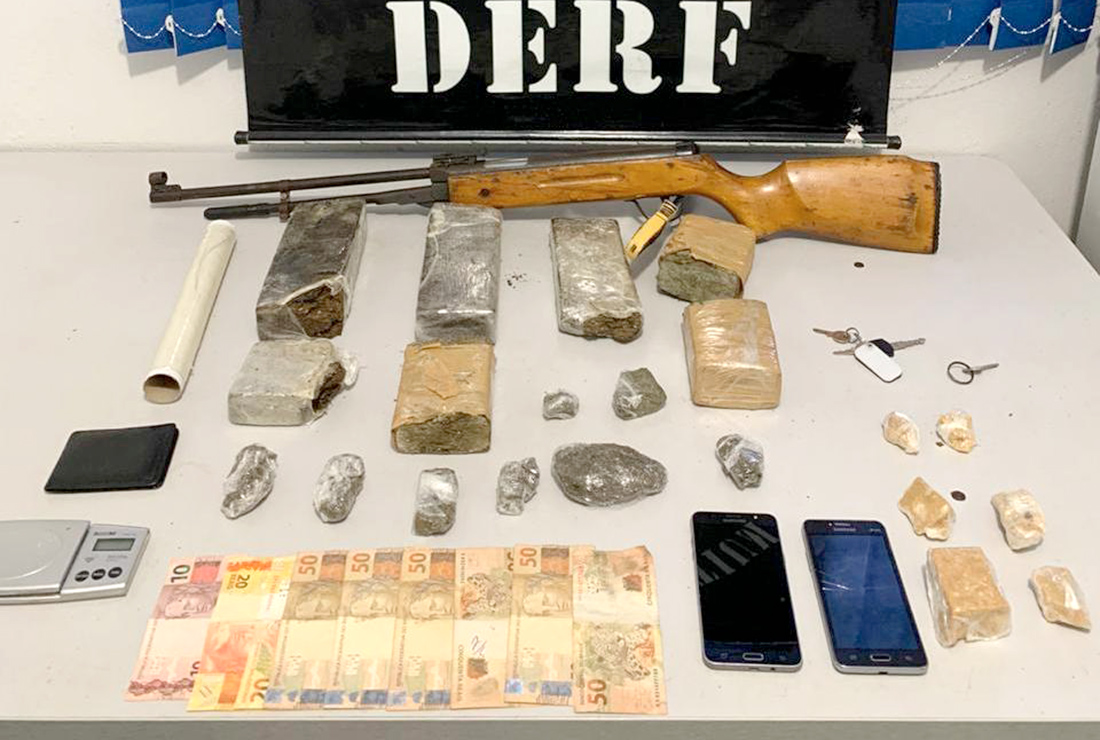 No local, também foi encontrada uma arma de fogo, calibre 22, tipo carabina, e R$ 400 em dinheiro. Diante das evidências, os três suspeitos, com idades de 28, 23 e 22 anos, foram conduzidos a DERF, onde após serem interrogados foram autuados em flagrante pelos crimes de tráfico de drogas, associação para o tráfico e posse irregular de arma de fogo.