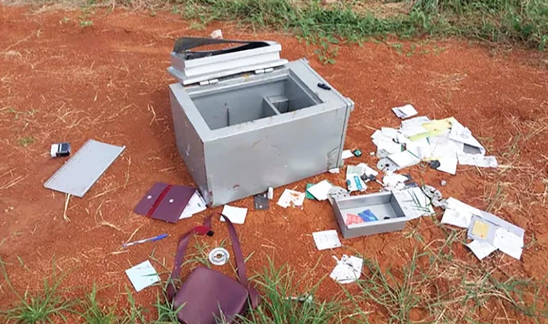 A porta do compartimento encontrava-se visivelmente danificada, indicando possível arrombamento. Também foram identificados diversos objetos espalhados, como documentos pessoais, cartões bancários e cheques (em branco e preenchidos).