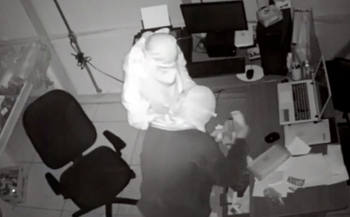 As câmeras de vigilância do local mostram o momento em que um dos criminosos tentar forçar a porta do estabelecimento, não consegue arrombar, sai e, logo em seguida reaparece com o outro comparsa. Juntos conseguem entrar no local, vão direto aos caixas e pegam o dinheiro.