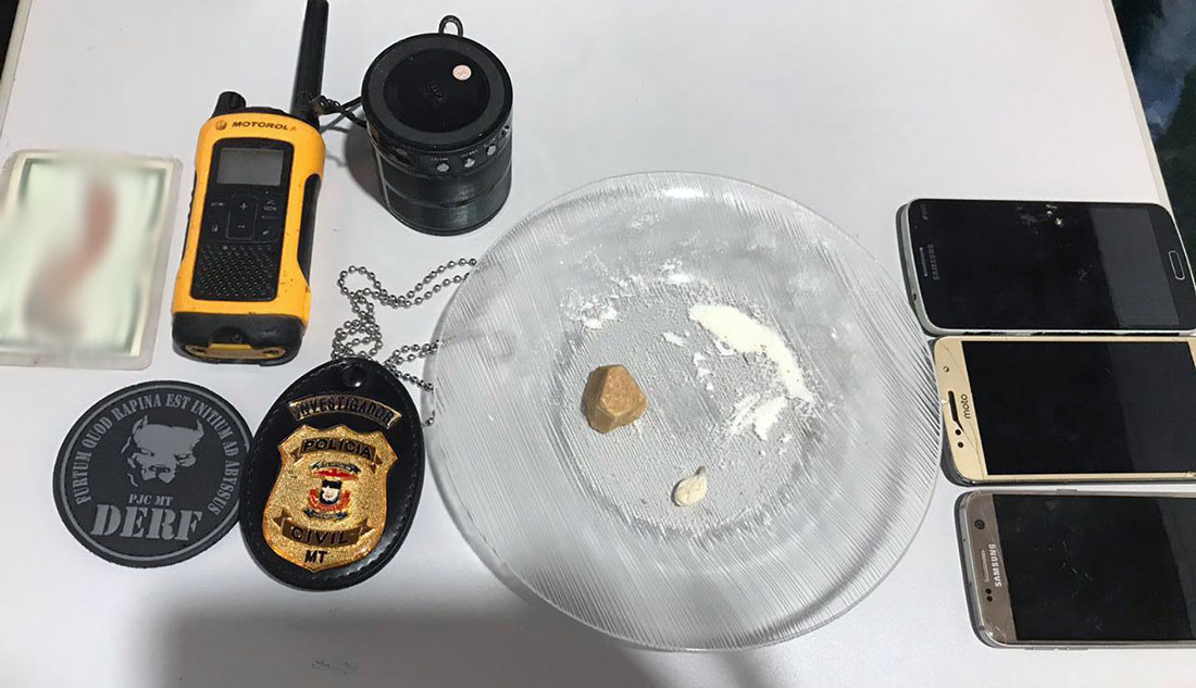 No local, os investigadores apreenderam três porções de pasta base de cocaína, um prato contendo cocaína e uma porção de maconha. Também foram apreendidos celulares, relógios, um rádio HT, uma máquina de cartão e uma caixa de som. Os suspeitos já possuem diversas passagens pela polícia.