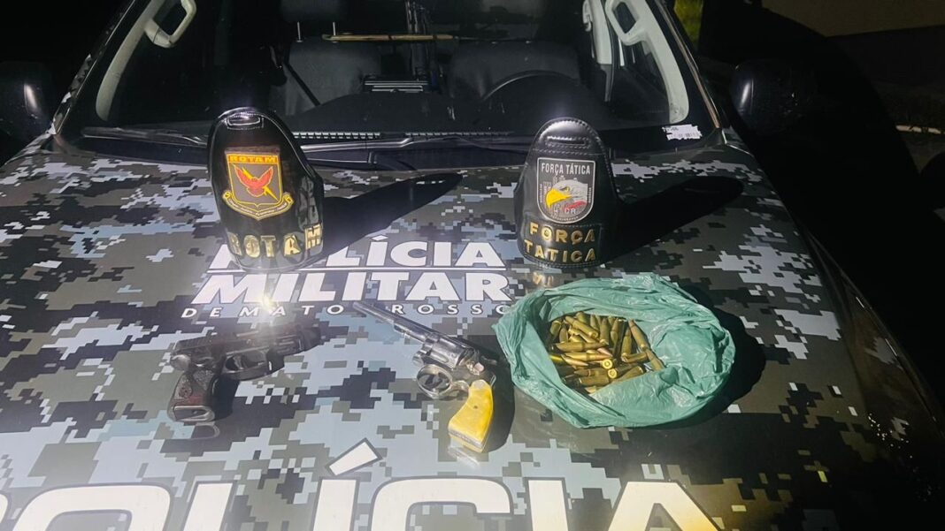 Com os suspeitos, a Polícia Militar apreendeu um revólver calibre .38, uma pistola 9 milímetros e dezenas de munições de fuzil .762.