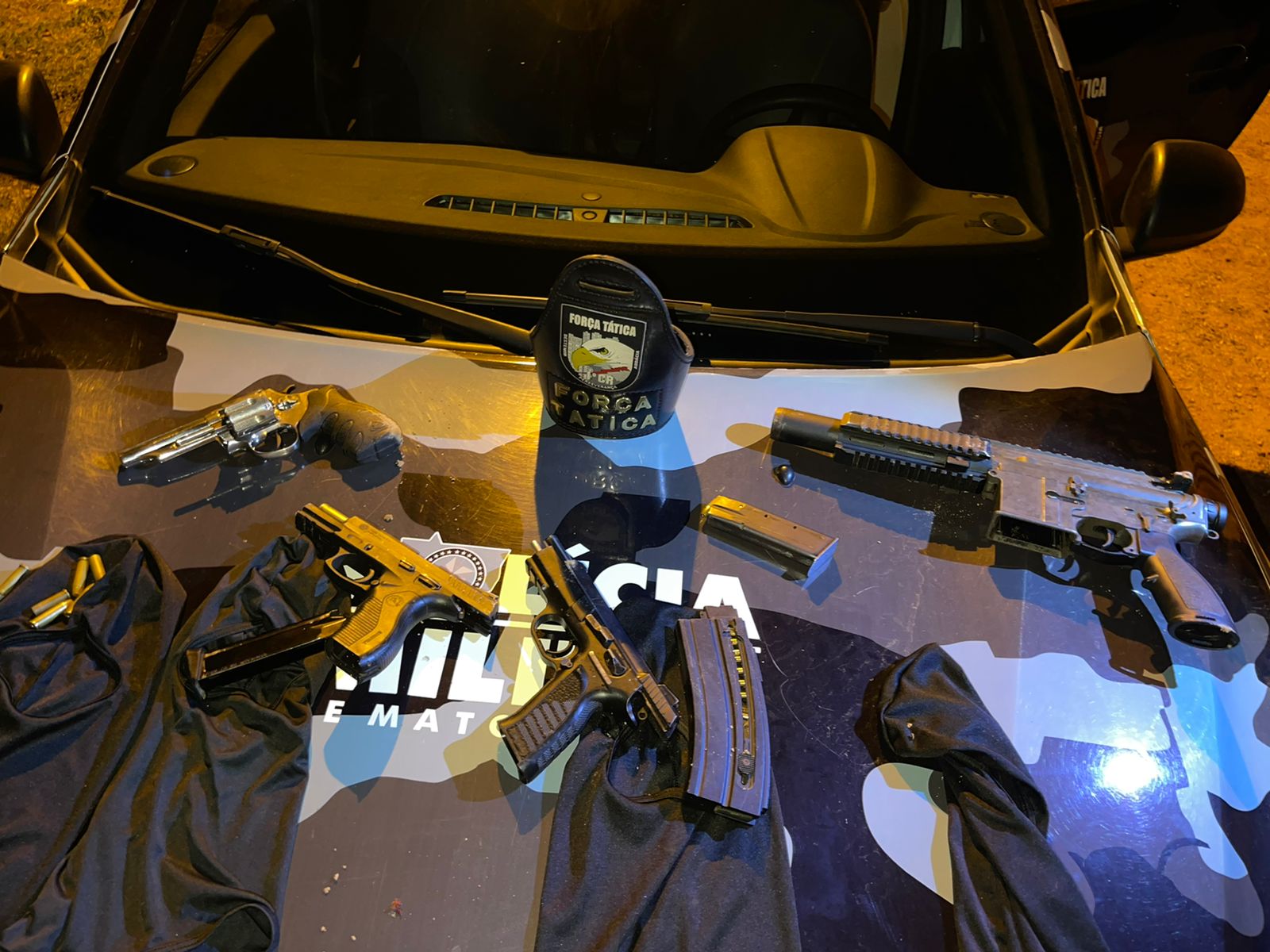 Conforme Só Notícias já informou, na troca de tiros em Cuiabá, foram apreendidos revólver calibre .38, duas pistolas e uma submetralhadora HK. O confronto foi após a PM receber informações sobre uma quadrilha fortemente armada, que estaria organizando um assalto.