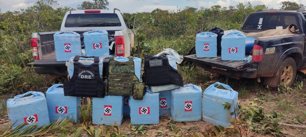 Uma ação conjunta das forças de segurança resultou na apreensão de aproximadamente 500 quilos de cocaína, esta tarde, no município de Conquista D’Oeste (530 quilômetros de Cuiabá). O entorpecente estava dividido em 15 fardos que continham a imagem da suástica, símbolo do nazismo.