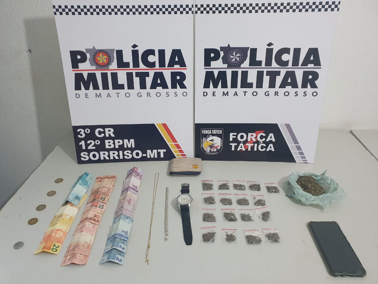 Policiais da Força Tática apreenderam, na madrugada deste domingo, várias porções de maconha em Sorriso. Os militares localizaram os entorpecentes durante patrulhamento no bairro Jardim dos Ipês.