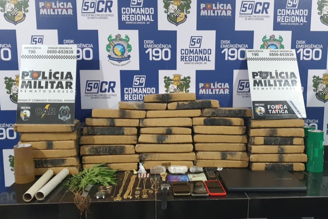 No imóvel, os militares descobriram que, a esposa dele respondia na justiça, pelo crime de tráfico de drogas e usava tornozeleira que foi danificada por ela. Durante buscas, os policiais descobriram que o local era usado como ponto de venda de entorpecentes. Em um dos cômodos, localizaram aproximadamente 35 tabletes de maconha.