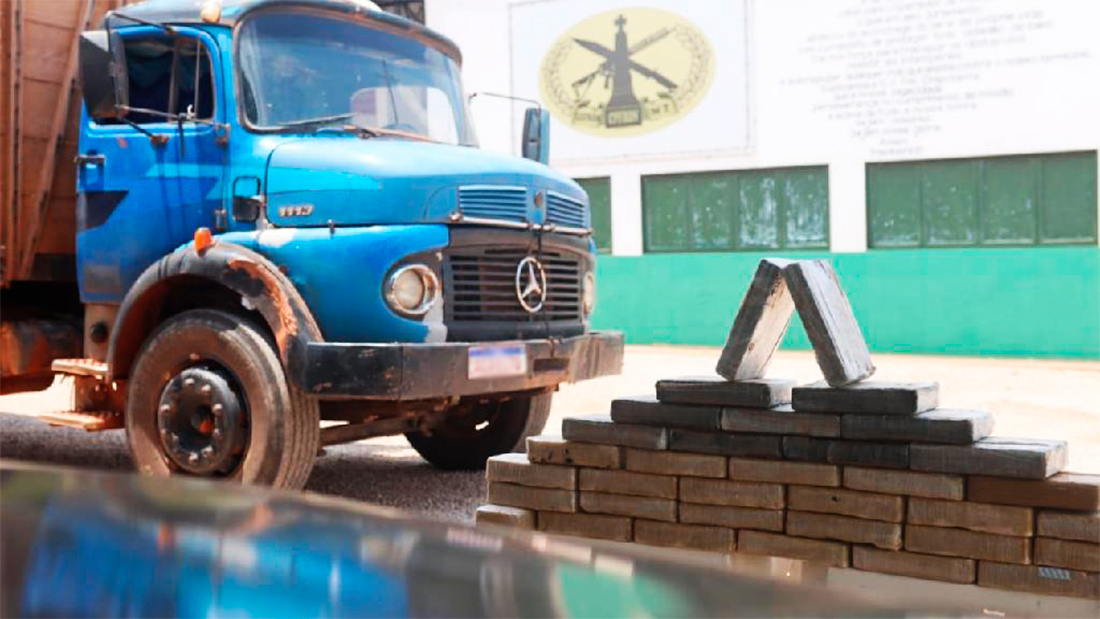 A guarnição abordou o caminhão, que seguia sentido Bolívia/Brasil. Durante busca veicular, foi encontrado compartimento oculto na carroceria onde estavam os 35 tabletes de cloridrato e pasta base de cocaína.