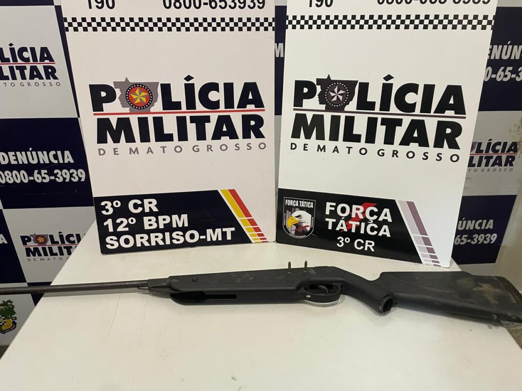 Um homem de 29 anos foi preso esta tarde por posse irregular de arma de fogo durante uma ação da Polícia Militar em Sorriso. Durante a abordagem, foram encontradas uma espingarda adaptada para calibre .22 e duas munições intactas do mesmo calibre.