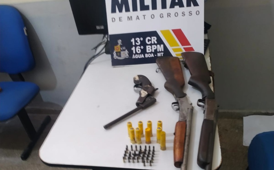 Um homem, de 66 anos, foi preso em flagrante pela Polícia Militar pelos crimes de caça e porte de arma ilegais e maus-tratos a animais, ontem, na zona rural de Água Boa. Na ação, três armas de fogo e facas foram apreendidas, enquanto seis cães maltratados, utilizados na caça de animais silvestres, foram resgatados.