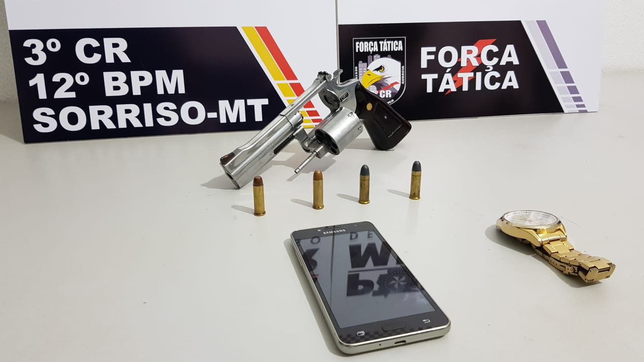Um jovem de 20 anos, acusado de ter envolvimento em um roubo em Sinop, foi preso, esta tarde, pela Força Tática da Polícia Militar. O suspeito foi localizado em uma casa, na rua G, no bairro Boa Esperança 2, em Sorriso. Com ele, os militares encontraram um revólver calibre 38, com quatro munições intactas.