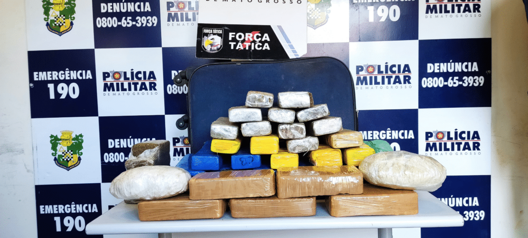 Policiais militares da Força Tática prenderam um homem de 25 anos por tráfico de drogas, ontem. Com o suspeito, foram apreendidos 37 quilos de maconha e cocaína. Conforme o boletim de ocorrência, as equipes policiais receberam informações do setor de inteligência sobre um homem que estava com grande quantidade de drogas em um ônibus, com destino a Sorriso. Em monitoramento na rodoviária, os militares flagraram o homem descendo do ônibus e embarcando em um táxi, com duas malas.