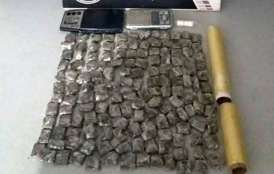 Dentro da sacola estavam 40 porções de maconha e uma balança. No terreno de onde o suspeito saiu, foram encontradas mais 108 porções da mesma droga, além de outra balança e filme plástico.
