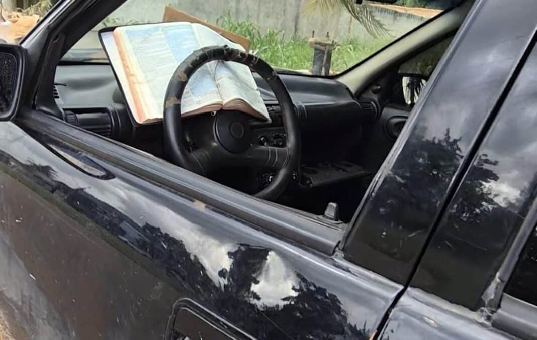 Ainda segundo a vítima, o suspeito chegou a dar uma volta na quadra, mas devido ao sistema de travamento, o veículo não andava mais de 5 km/h. “Ele voltou e deixou o carro bem aqui onde está, na frente de casa mesmo. Nós somos evangélicos, então ele abriu a Bíblia no Salmo 91 e deixou em cima do volante aqui, né? Isso aqui foi o que me chamou a atenção, dessa forma, eu creio que Deus tomou por ele, né?”, disse o proprietário.