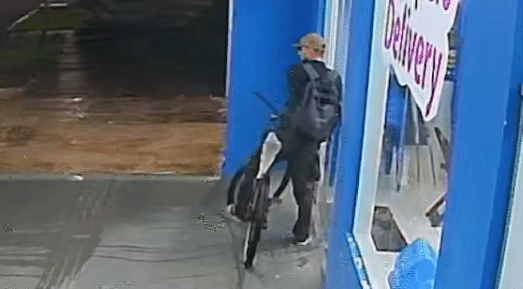 Em imagens registradas pelo sistema de monitoramento, é possível ver que, por volta das 2h20, o suspeito se aproxima da entrada e começa a forçar a porta de vidro, e em certo momento o vidro é quebrado e ele adentra o local, indo até o caixa e pegando o dinheiro. Em seguida, ele foge de bicicleta.
