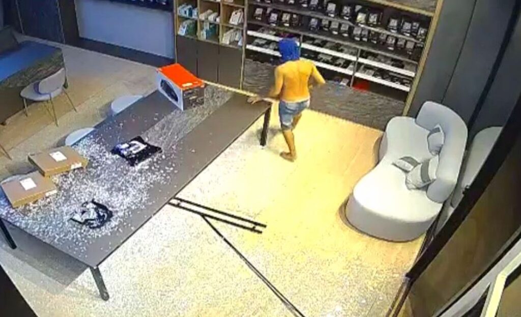 Em imagens registradas por câmeras de segurança, por volta da 1h40, é possível ver o momento em que os assaltantes derrubam a porta de vidro, que se estilhaça ao bater na mesa com expositores de produtos. Em seguida, eles entram e começam a colocar diversos produtos em mochilas, além de abrir caixas para retirar seu conteúdo.