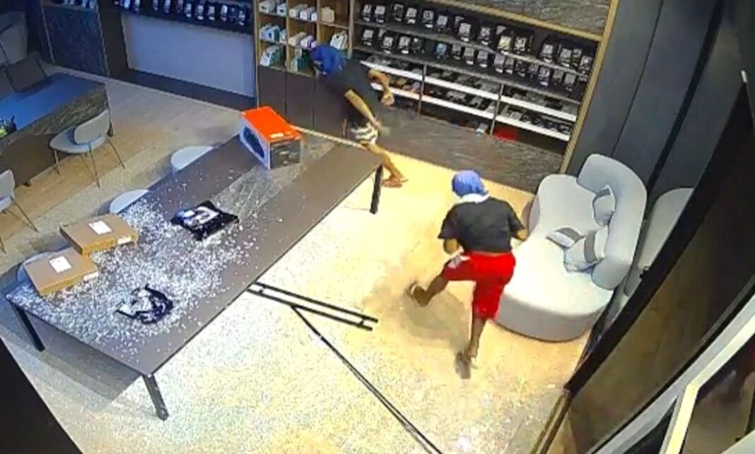 Em imagens registradas por câmeras de segurança, por volta da 1h40, é possível ver o momento em que os assaltantes derrubam a porta de vidro, que se estilhaça ao bater na mesa com expositores de produtos. Em seguida, eles entram e começam a colocar diversos produtos em mochilas, além de abrir caixas para retirar seu conteúdo.