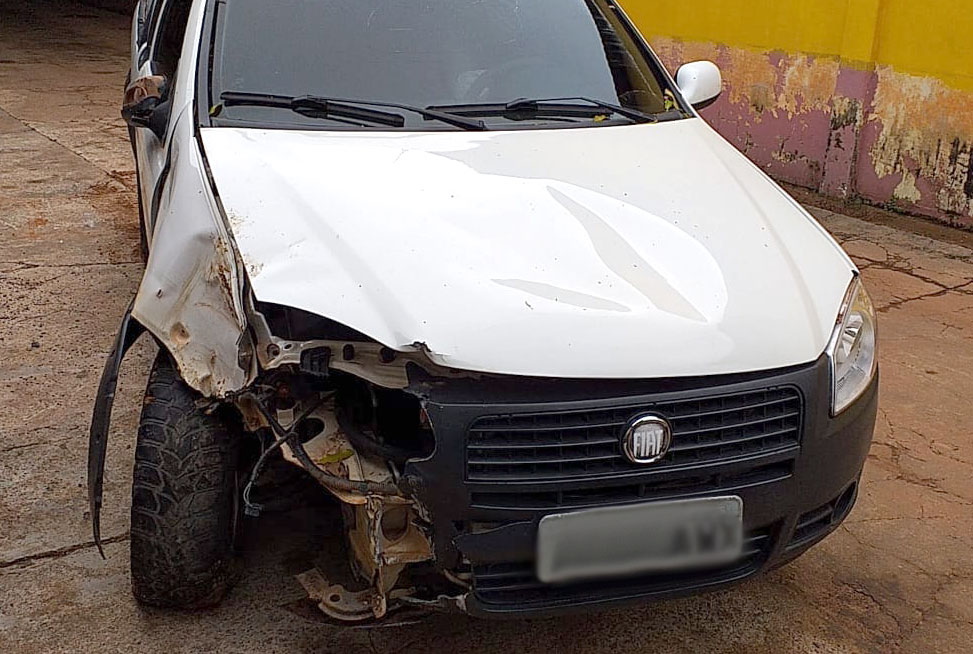O Fiat Strada teve diversas danificações na lateral e na parte frontal. Uma empresa de guincho fez o recolhimento do local.