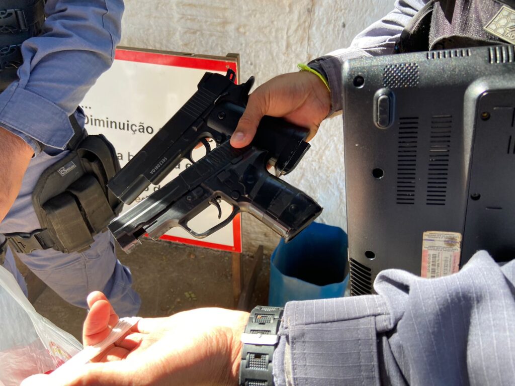 Com ajuda do pai do suspeito, os policiais realizaram buscas na casa e localizaram a motocicleta e materiais ilícitos. “Pedimos autorização ao proprietário da residência, que é o genitor do que está apreendido. Ele autorizou nossa entrada, onde em checagem foi constatado a motocicleta como produto de roubo. Em busca domiciliar localizamos dois simulacros de arma de fogo, entorpecentes, balança de precisão e vasto material para embalar esse entorpecente”, finalizou