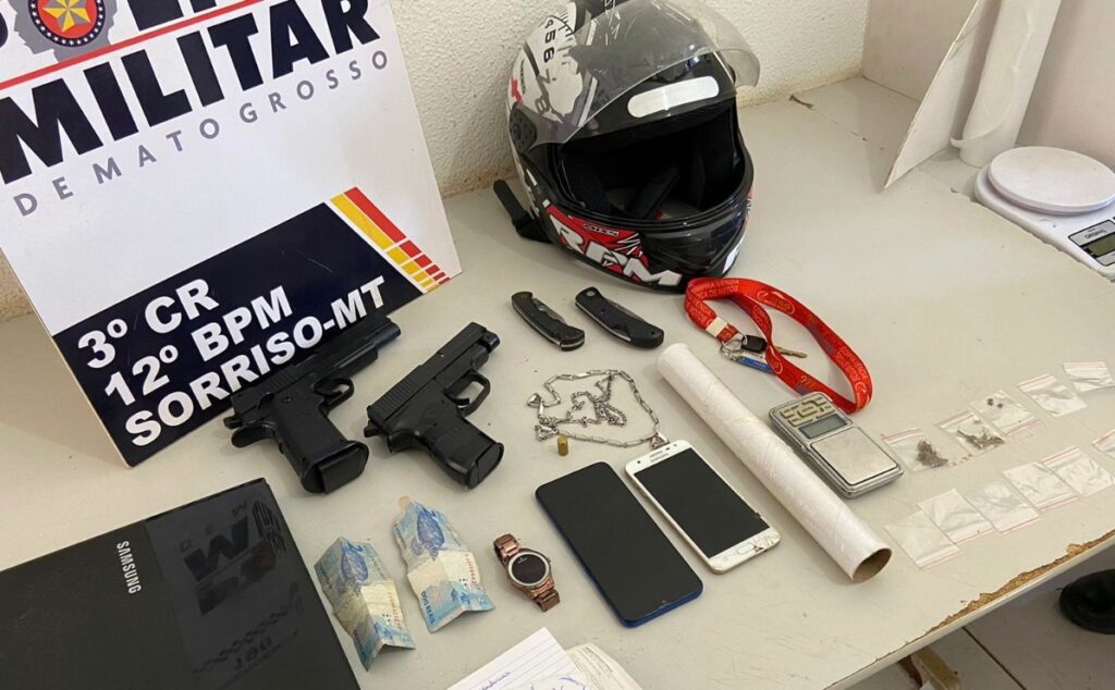 Mulher é presa e adolescente apreendido com motocicleta roubada, entorpecentes e simulacros em Sorriso
