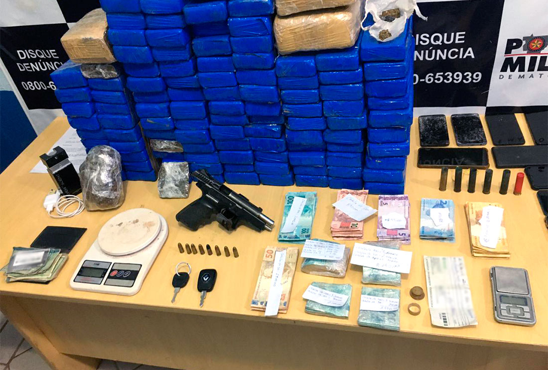A Polícia Militar prendeu, ontem, por volta das 20h, cinco homens, de 18, 32 e 21 anos, acusados de envolvimento com tráfico de drogas, na região de Tapurah (97 quilômetros de Lucas do Rio Verde). Com eles, foram apreendidos 126 tabletes de maconha, pasta base de cocaína, balança, pistola calibre 9 milímetros com um carregador, munições, celulares, um Ford EcoSport, Renault Kwid e mais de R$ 26,1 mil que podem ser da venda das drogas.
