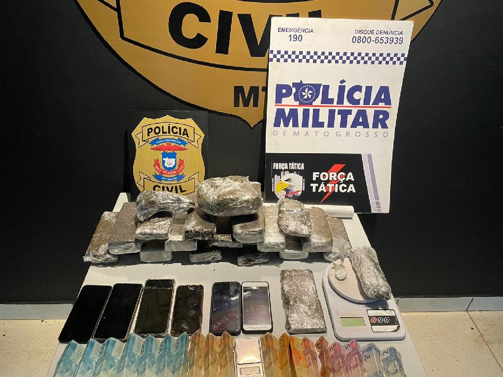Policiais militares da Força Tática do 7º Comando Regional prenderam dois homens, de 22 e 24 anos, e realizaram a apreensão de 10 quilos de substância análoga a maconha e diversas cestas básicas, na noite deste sábado, em Tangará da Serra. As cestas básicas seriam distribuídas para membros de uma organização criminosa da cidade.