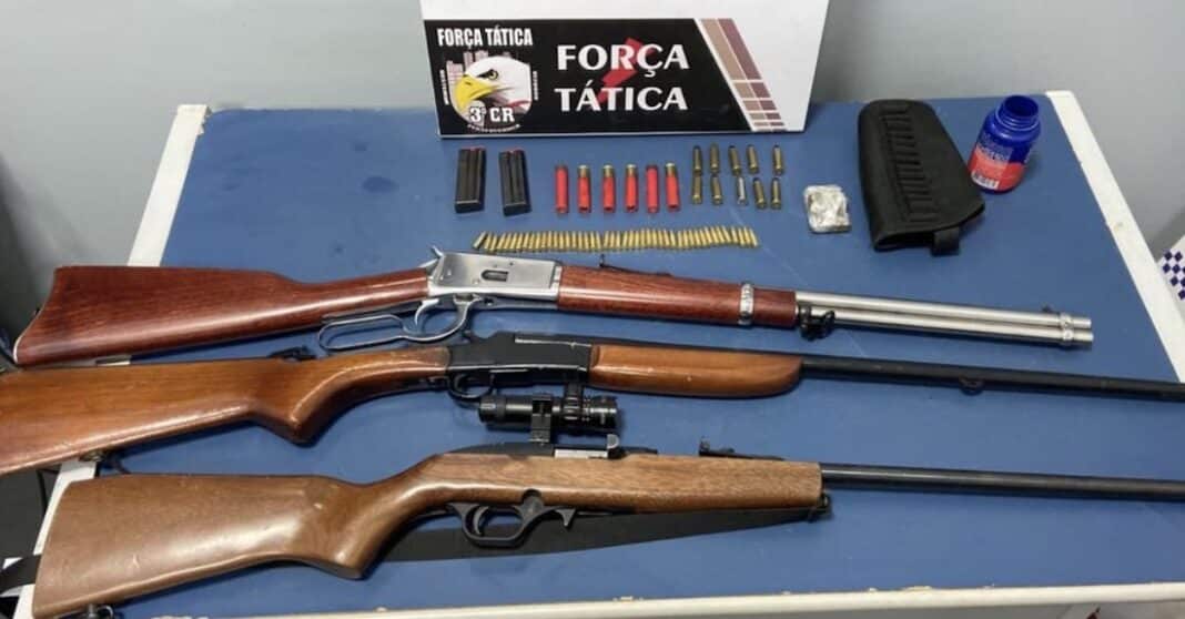 Policiais militares da Força Tática apreenderam, ontem, por volta de 23:30h, carabina calibre 357, uma espingarda calibre 36, um rifle calibre 22, além de 55 munições de diversos calibres e oito cartuchos, no Jardim das Oliveiras. Um homem foi preso por porte de arma de fogo e comércio ilegais.