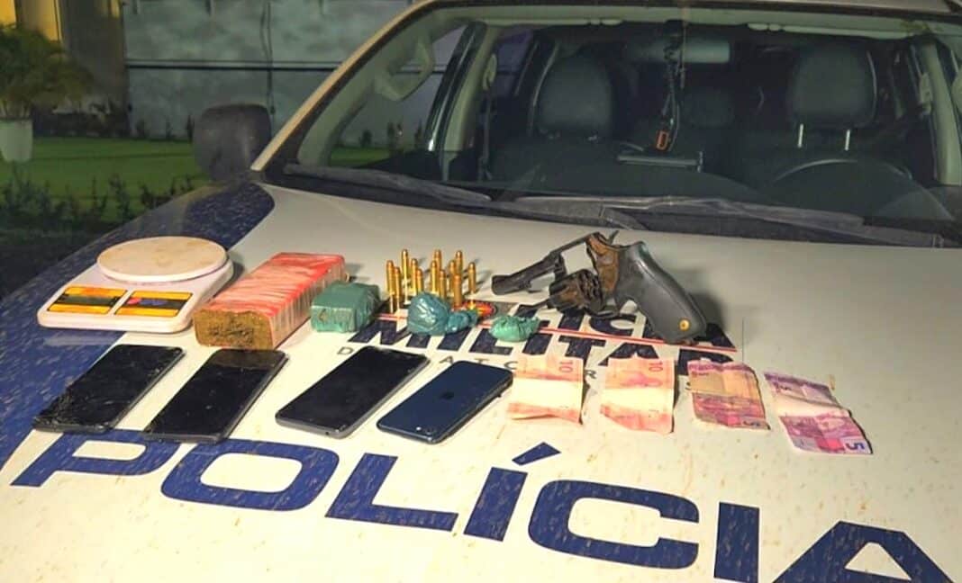 A equipe de Polícia Militar de Santa Carmem (35 km de Sinop) apreendeu um revólver e munições calibre 38, porções e tablete de maconha, dinheiro, quatro aparelhos celulares e uma balança de precisão. Uma mulher foi detida e encaminhada para prestar esclarecimentos.