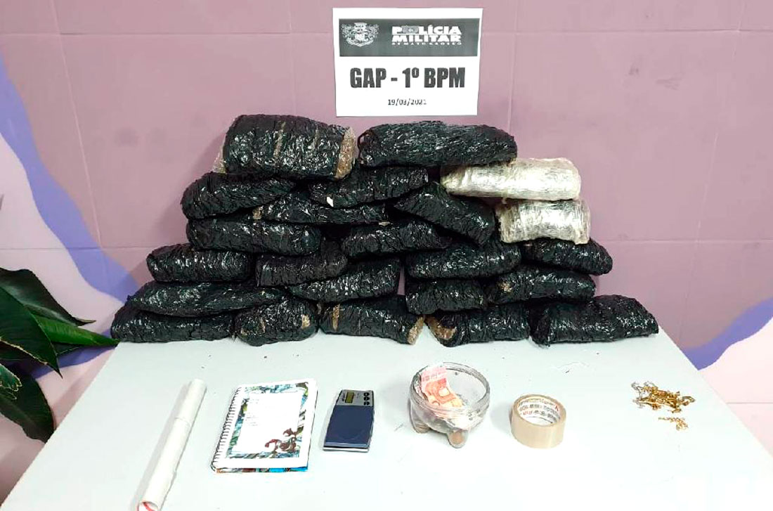 Os policiais militares Grupo de Apoio prenderam um homem, de 19 anos, por violência doméstica e descobriram que na casa dele funcionava uma central de distribuição de droga, no bairro Areão, em Cuiabá. No local foram apreendidos 23 tabletes de maconha skank (supermaconh), além de um caderno com a contabilidade do tráfico e nomes de compradores, uma balança de precisão, papel filme e R$ 45 em dinheiro.