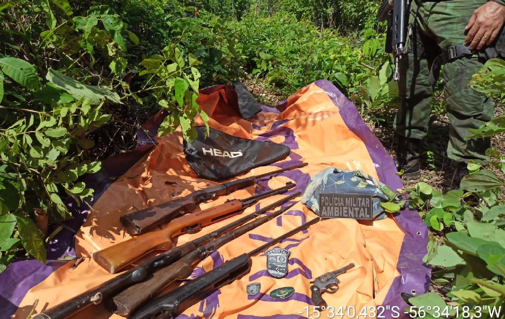O Batalhão de Polícia Militar de Proteção Ambiental apreendeu cinco espingardas, um revólver e uma motosserra, em uma área de desmatamento de extração irregular de madeira, no Assentamento Sadia 3, em Várzea Grande.