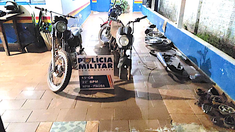 No local, os policiais encontraram o homem apontado e outro suspeito desmontando duas motos. Os policiais conseguiram descobrir que as motocicletas também estavam com a numeração raspada.
